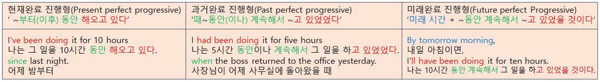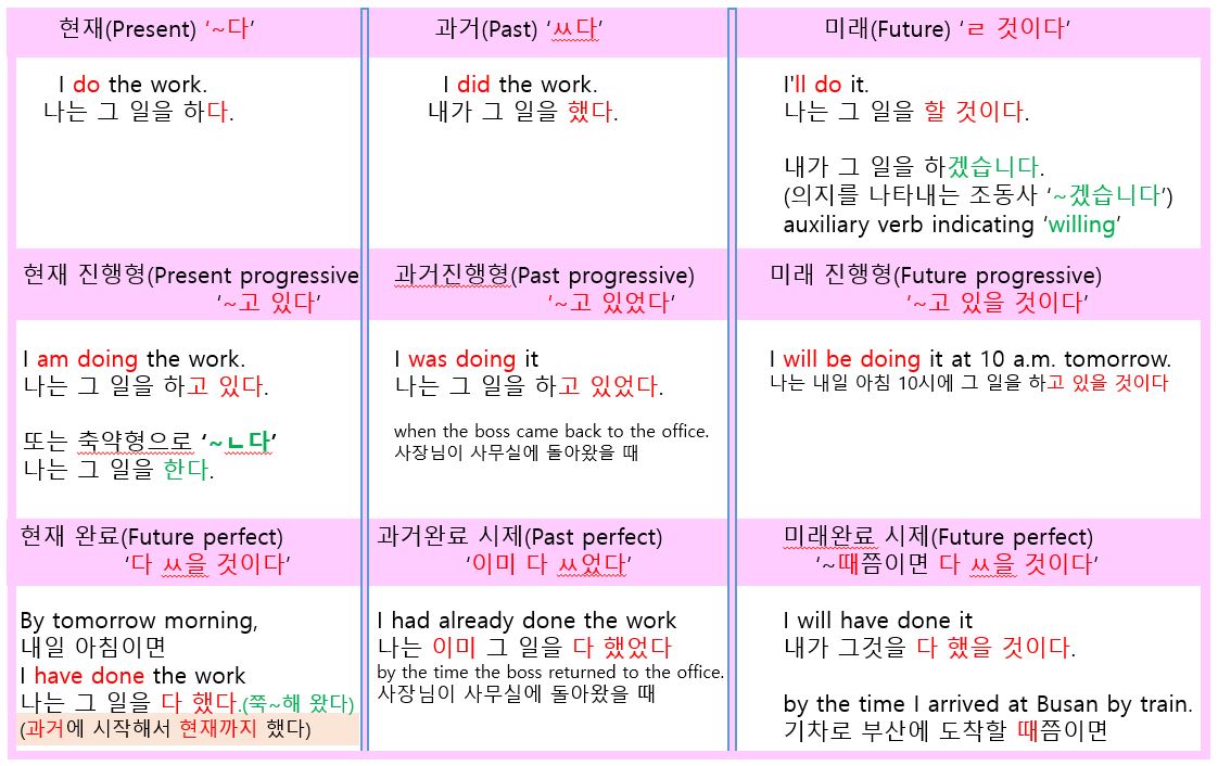 다음 순서로는 실제 문장에서 어떻게 한국어와 영어의 12 시제가 정말로 사용되는지 알아보겠습니다. 한국어와 영어 단어의 글씨는 색깔별로 동일한 시제를 나타낸다.